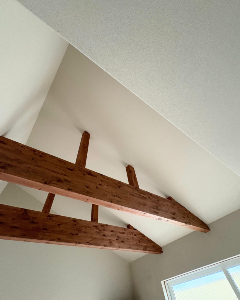 重なり合う和の情緒: 勾配天井の開放感と、木質感あふれる洗練された和の意匠。